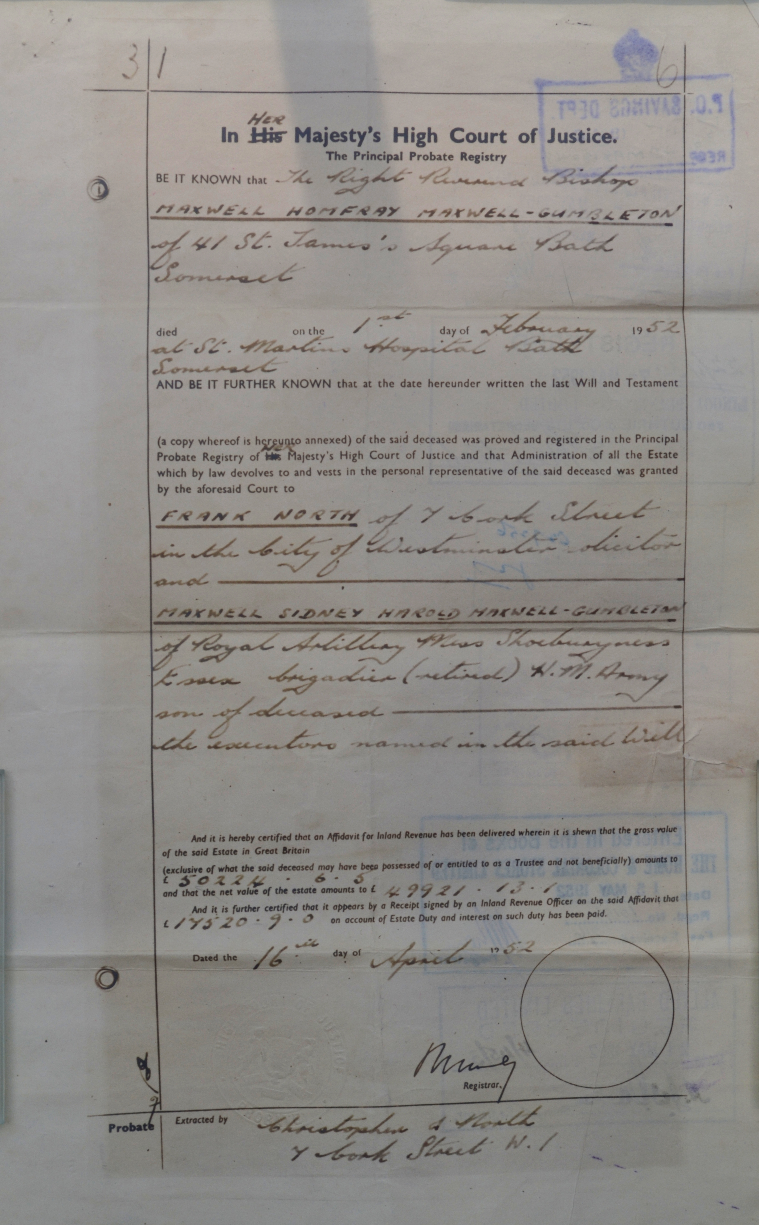 Be it known that The Right Reverend Bishop Maxwell Homfray Maxwell-Gumbleton of 41 St James's Square, Bath, Somerset died on the 1st day of February 1952 at St Martins Hospital Bath Somerset