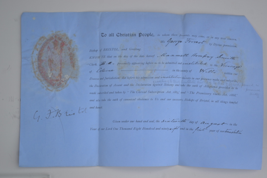 Know ye that on the day of the date hereof Maxwell Homfray Smith Clerk BA personally appearing before us to be admitted and instituted to the Vicarage of Colerne in the County of Wilts