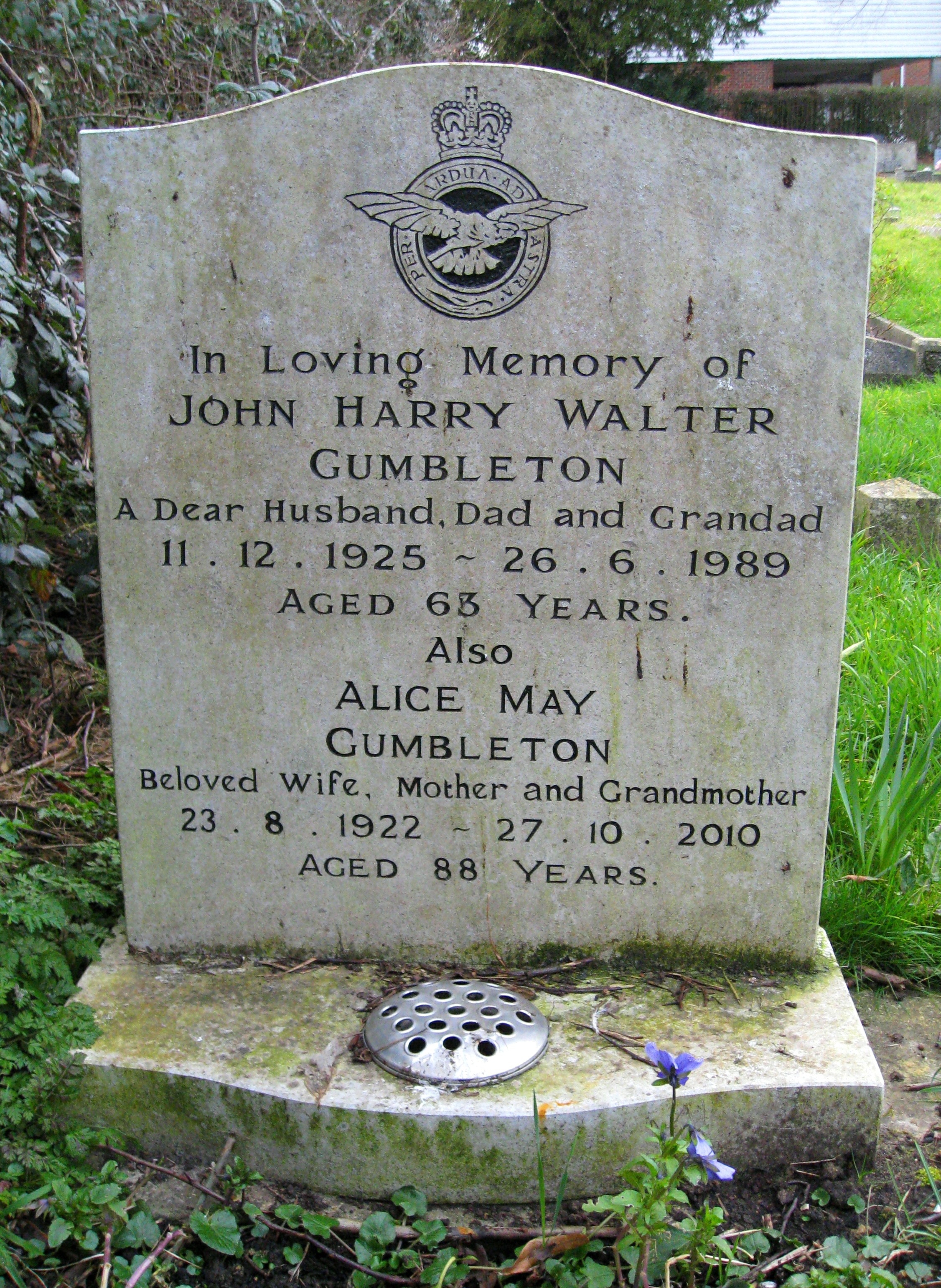 In Loving Memory of John Harry Walter Gumbleton A Dear Husband, Dad and Grandad 11.12.1925 - 26.6.1989 Aged 63 years. Also Alice May Gumbleton Beloved Wife, Mother and Grandmother 23.8.1922 - 27.10.2010 Aged 88 yearsBurial: All Saints Churchyard Writtle Chelmsford Borough Essex, England